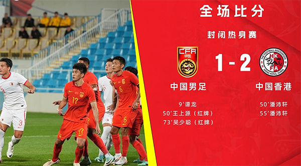 来源:直播车01-02 11:13直播车01月02日讯 国足在亚洲杯之前最后一场热身赛,以1-2不敌中国香港,时隔38年再度不敌对手。这场比赛是封闭进行的,没有直播,本场王上源和吴少聪先后染红,关注度助教也被红牌驱逐,最终国足在通过谭龙先进一球的情况下,被中国香港逆转,对手进球的是潘沛轩,他上演梅开二度的好戏,逆转击败国足。