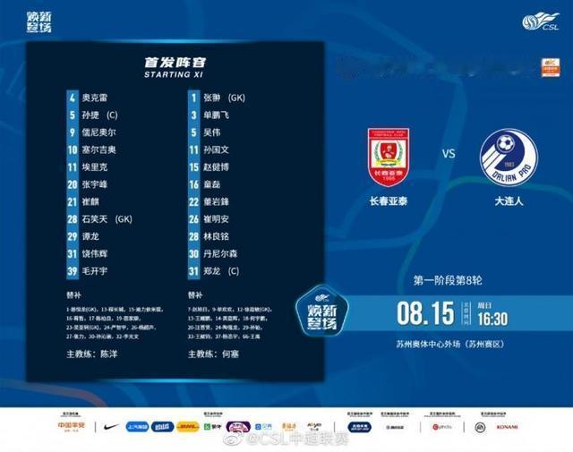 直播车讯 中超第8轮补赛,苏州赛区第一阶段收官战,长春亚泰vs大连人首发出炉。
