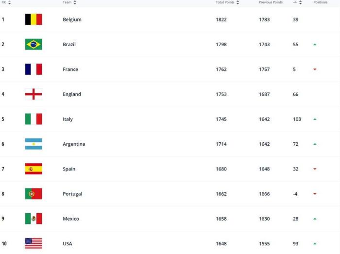 来源:直播车08-12 19:52直播车讯 今天FIFA更新了最新一期排名。其中,比利时世界第一,法国第三,巴西从第三升至第二,英格兰第四,意大利升到第5位。