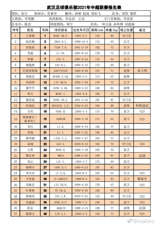武汉队球员名单: