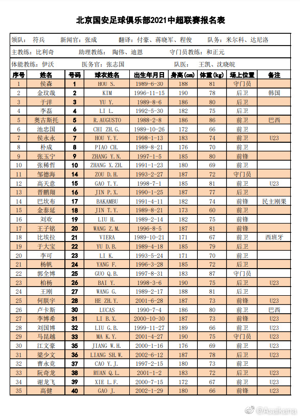 2021-22赛季中超北京国安球员名单一览