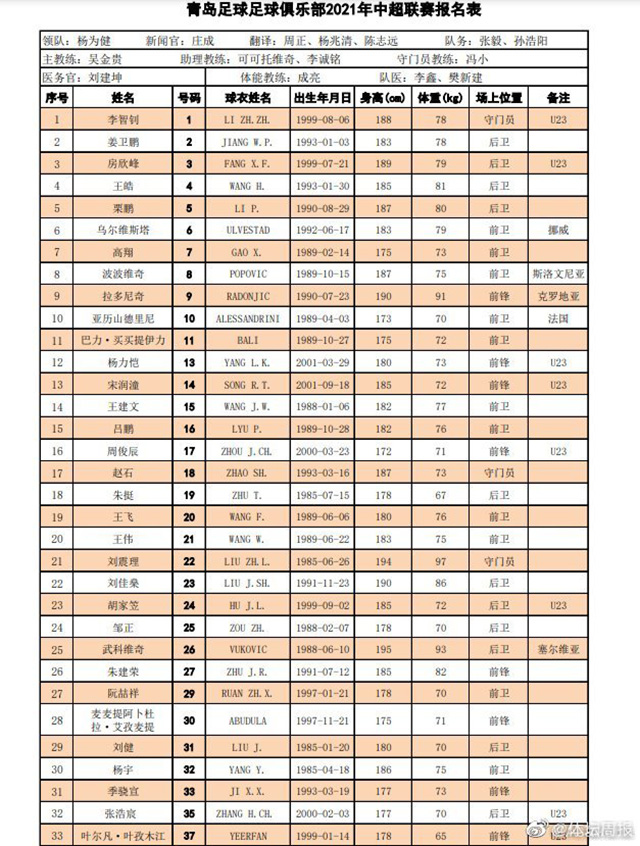 后卫:姜卫鹏、王皓、栗鹏、朱挺、王伟、刘佳燊、武科维奇、刘健、张浩宸、邹正