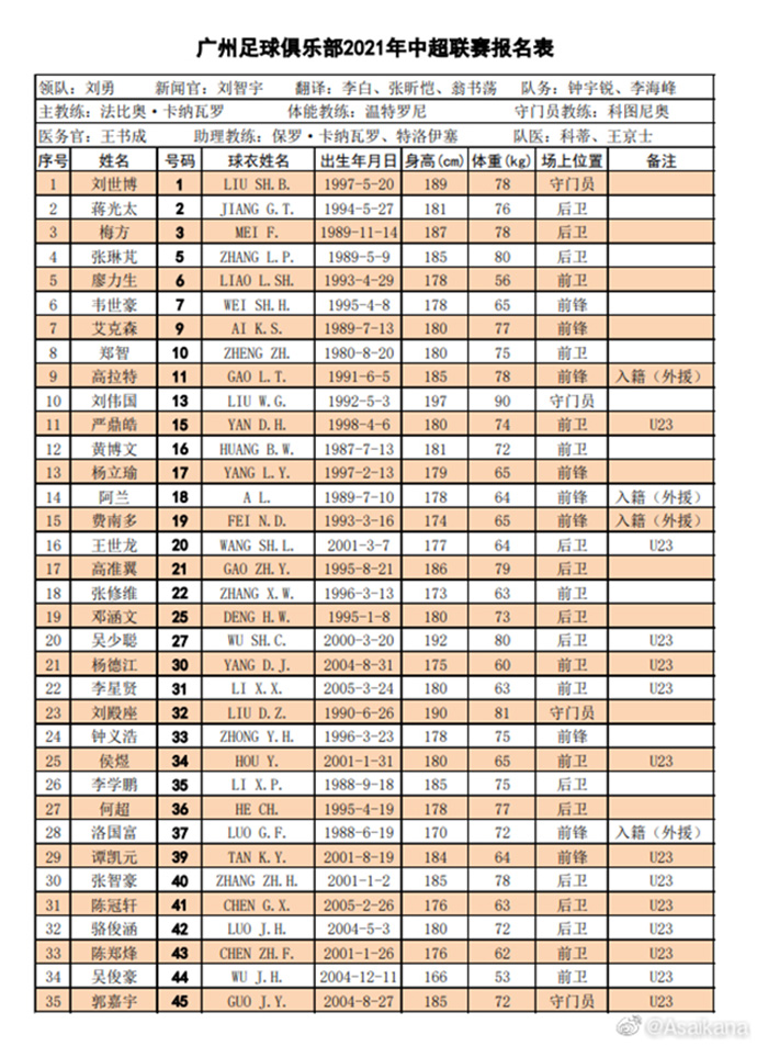 广州队球员名单: