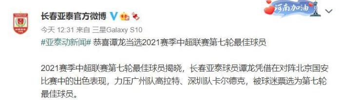 直播车讯 北京时间7月24日,长春亚泰官方宣布,队内前锋谭龙当选中超第7轮最佳球员。