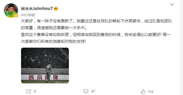 直播车讯侯永永写道:大家好,有一阵子没有更新了。我最近还是在球队的帮助下疗养膝伤,经过队医和团队的商量,很遗憾我还需要做一次手术。