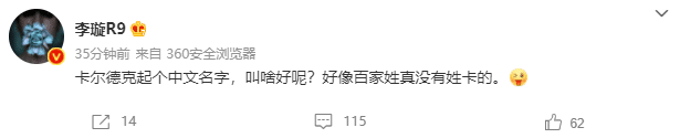深足外援卡尔德克此前在接受采访时曾透露自己的归化工作正在进行当中,今天李璇在微博表示:“卡尔德克起个中文名字,叫啥好呢?好像百家姓真没有姓卡的。”