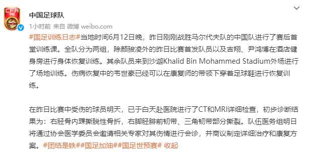 国足官方:明天胫骨内踝撕脱性骨折,两处韧带撕裂