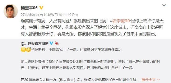来源:直播车06-12 21:27直播车讯近日,前大连球员卡拉斯科在接受采访时表示,足球在中国不是很受欢迎,回到欧洲才意识到自己的幸运。对此,卡拉斯科的前队友杨善平表示,他德人品有问题。