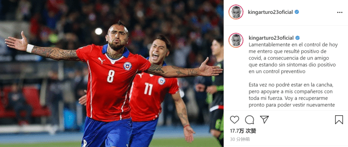 直播车讯据智利国家队官方消息,中场老将阿图罗-比达尔感染新冠,目前他正在隔离。