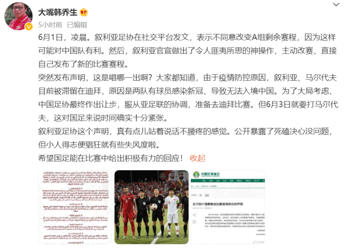 韩乔生写道:“6月1日,凌晨。叙利亚足协在社交平台发文,表示不同意改变A组剩余赛程,因为这样可能对中国队有利。然后,叙利亚官宣做出了令人匪夷所思的神操作,主动改赛,直接自己发布了新的比赛赛程。”