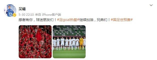 北京时间5月30日,中国7-0大胜关岛。赛后吴曦发微博庆祝道:“感谢有你,球迷朋友们!继续加油,兄弟们!”