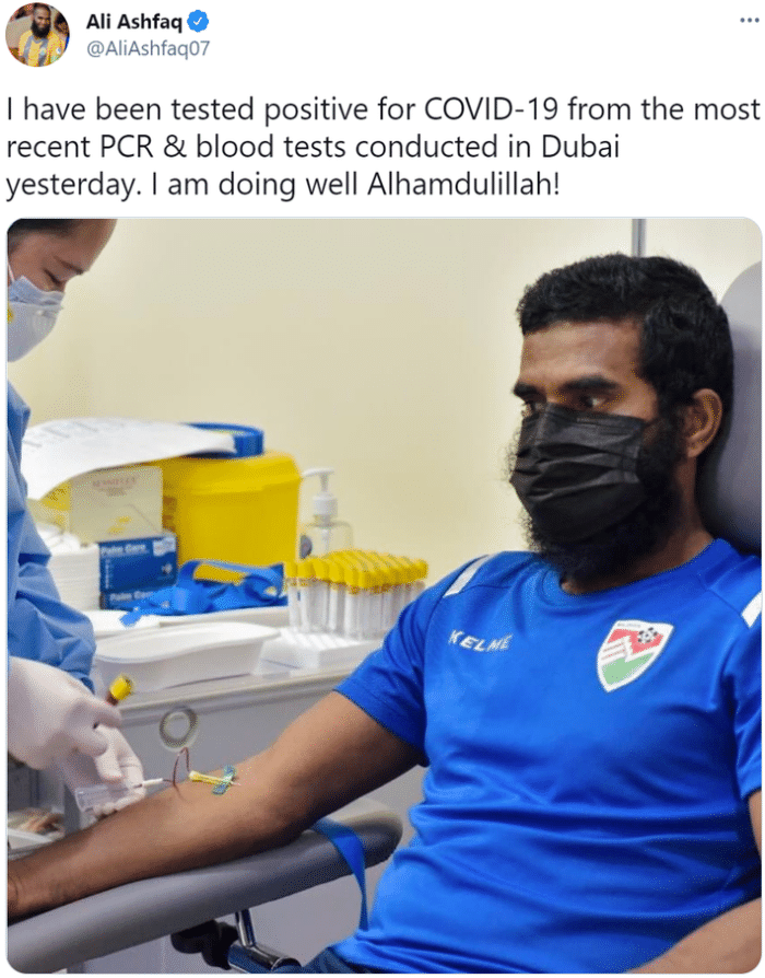 来源:直播车05-30 15:07直播车讯 马尔代夫传奇老将阿里-阿什法克日前在推特上证实自己感染新冠,将无缘参加对阵中国的40强赛。