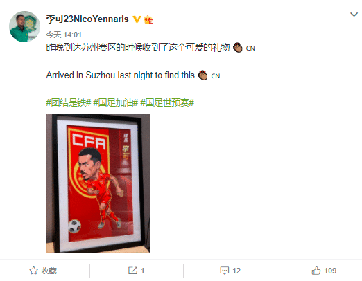 苏州赛区为每位国脚都准备了一个漫画形象的海报,李可对于自己的海报非常喜欢,他在微博晒照并用中英文写道:“昨晚到达苏州赛区的时候收到了这个可爱的礼物。”