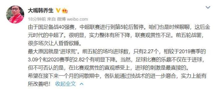 来源:直播车05-19 10:27直播车讯 北京时间5月19日,评述员韩乔生在个人社交媒体上发表了他对本赛季中超联赛的看法。