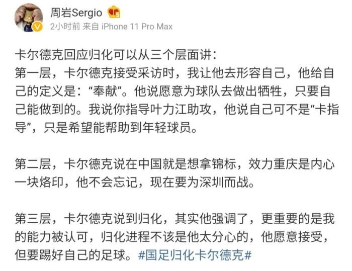 来源:直播车05-18 20:18直播车讯 5月18日 对于卡尔德克在接受采访时透露自己的归化正在进行之中,对此,采访他的记者周岩在个人微博进一步透露: