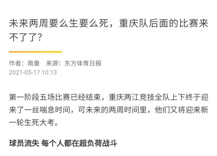 直播车讯 据《东方体育日报》消息,休赛期重庆两江竞技的命运会见分晓,未来两周的内要么生要么死,俱乐部的存亡问题已经没有灰色地带了,一线队已经做好了最坏的打算。