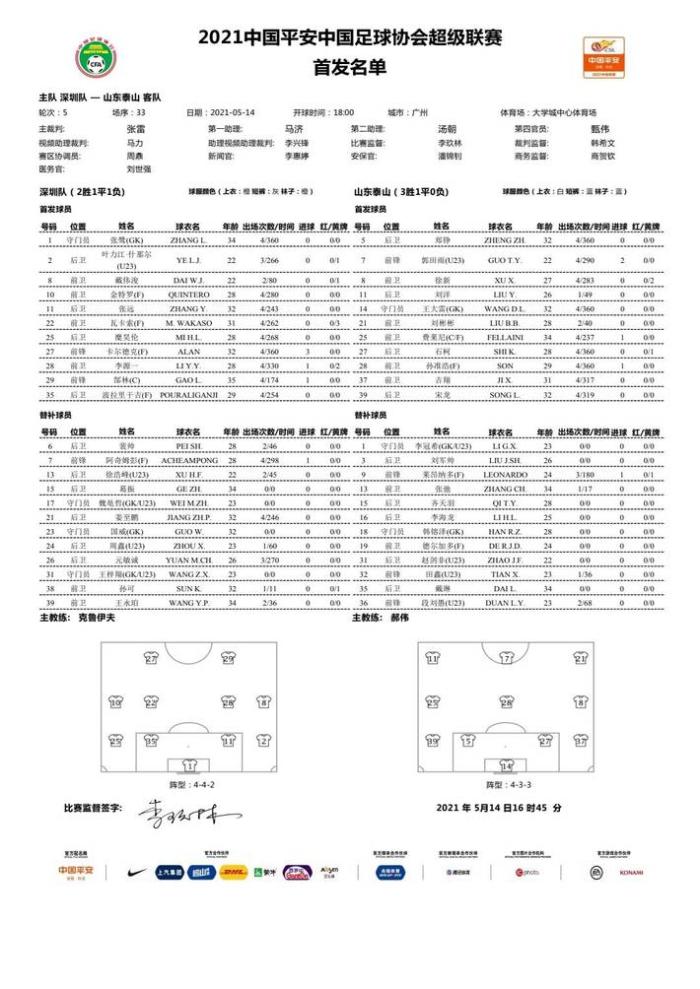 来源:直播车05-14 19:56直播车讯北京时间5月14日18:00,中超第五轮,深圳将迎战山东泰山。赛前,双方公布了本场比赛的名单。