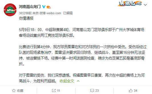 对于图雷的受伤,我们深感遗憾。祝福图雷早日康复,再次在中超的赛场上为河南战斗,为胜利而超越。