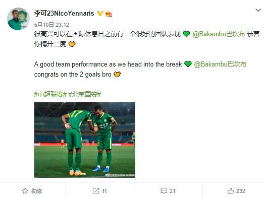 直播车讯 北京时间昨晚,凭借巴坎布的梅开二度,北京国安2-0战胜武汉,迎来两连胜。赛后,李可更新个人社交媒体为本巴坎布送上祝贺。