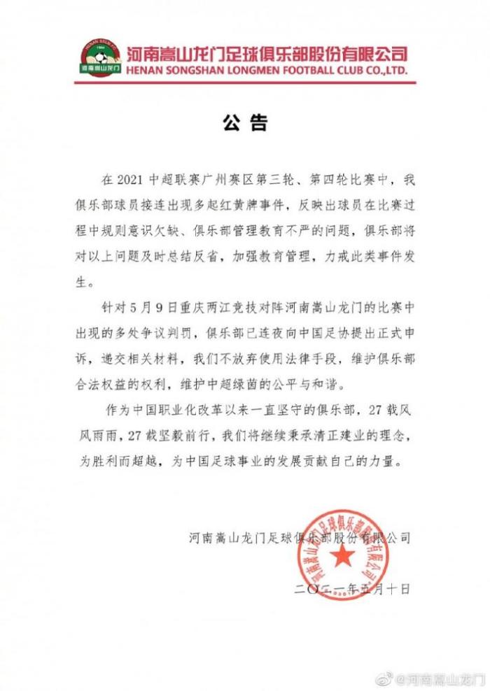 来源:直播车05-10 16:27直播车讯 今天,河南嵩山龙门俱乐部发布公告,就昨晚与重庆两江竞技比赛中的争议判罚向足协提出申诉。