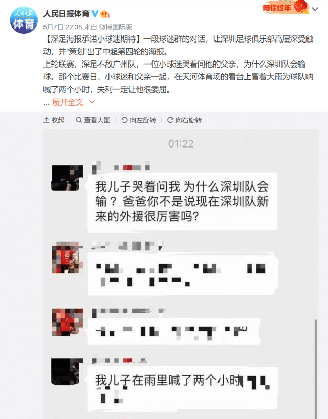 在争夺“湾区一哥”的头衔失败之后,深圳市足球队成为“广东德比”的手下败将仍然有“后遗症”。有媒体爆料称,有一名深足的老球迷打着自己的儿子去天河体育中心看球,两人都被雨水淋了两个小时却看到球队两球失利。他的儿子向他发文:为什么深圳队会输,外援不是很厉害吗?而且,这一位小球迷对于深圳市足球队输球根本接受不了。