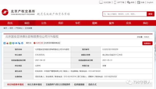 5月7日,根据北京产权交易所官网的消息,北京国安足球俱乐部有限公司正在寻求36%转让,据悉,此前北京国安有两大股东,中赫置地有限公司、中国中信有限公司分别持有该公司64.00%、36%的股份,根据目前显示的情况,很有可能是占据36%股份的中信不再对足球感兴趣,值得一提的是,除了股权转让之外,北京国安俱乐部还被爆出了一条被执行的信息,这条执行信息中,北京国安需要支付3879万元人民币。