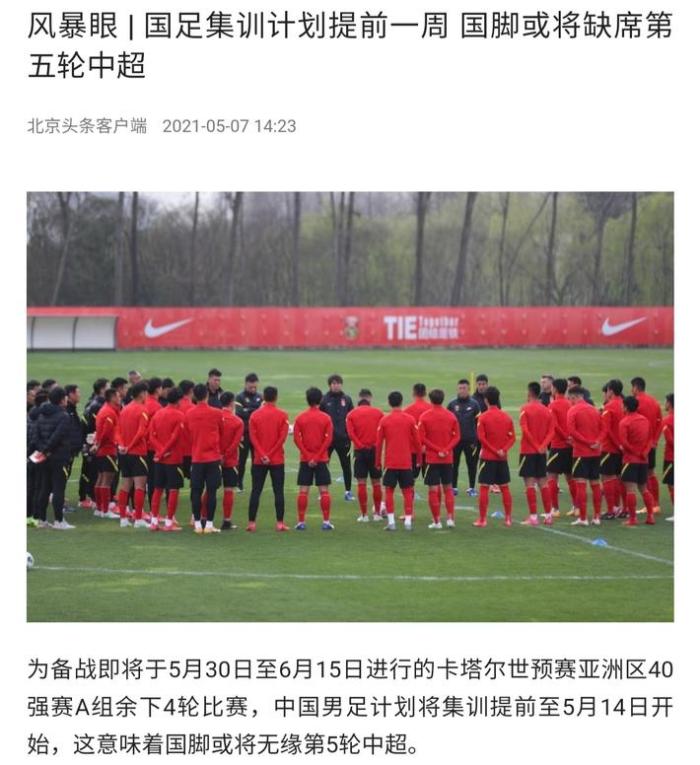 直播车讯 5月7日据《北京青年报》报道,由于国足新一期的集训将提前开始,这意味着国脚或将无缘第5轮中超。