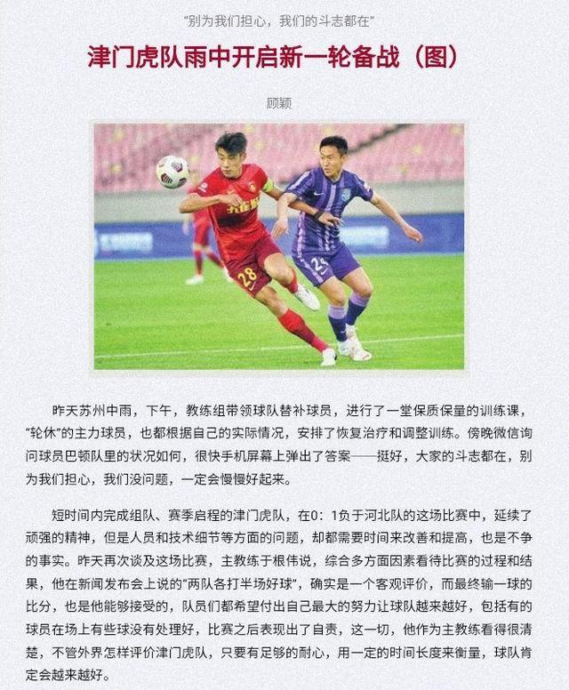 直播车讯 北京时间5月7日,在中超第三轮联赛,天津津门虎0-1负于了河北队。《天津日报》撰文表示,虽然输掉比赛,但津门虎全体队员展现出了顽强的精神,至于人员和技术细节方面,的确需要时间慢慢提高。