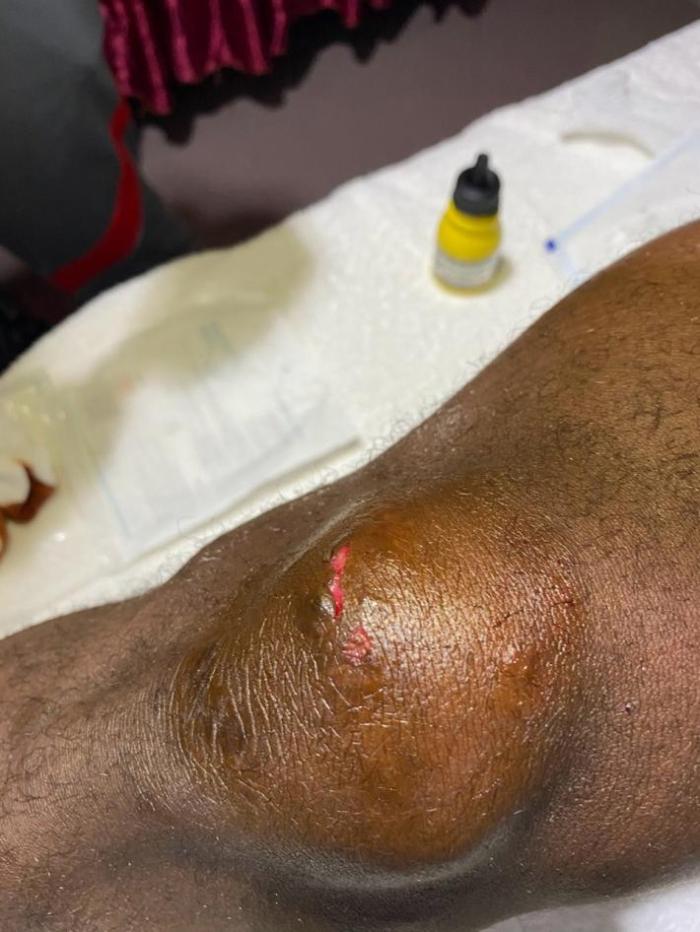直播车讯 4月29日消息,申花新闻官马悦赛后晒出外援巴索戈的伤口图,巴索戈的膝盖肿胀明显,而且开了个口子,可以看到皮肉。