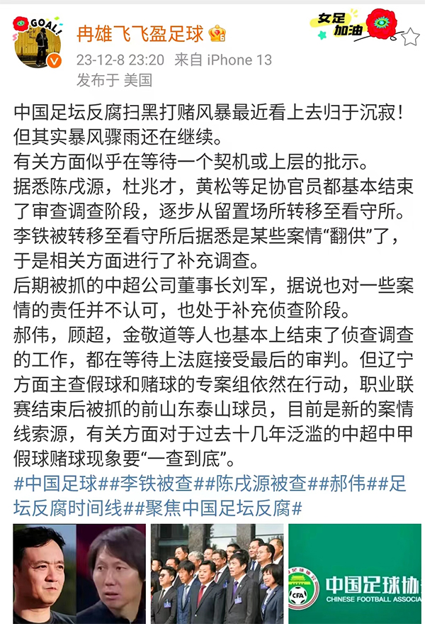 第三个讯息是球迷最最关心的李铁,李铁这边的动静可能还不少,根据冉雄飞的报道,李铁被转移到看守所后对于某些案情“翻供”了,于是相关方面进行了补充调查,要知道李铁接触的都是核心的人和事事务,李铁翻供大概率会带出更多的人和事情,甚至还有可能牵引出大鱼来,要知道在上一波的足球风暴中,可是有几条被传出要出事的大鱼最终平稳落地,而且裁判方面,至今交出的成绩单也很难让球迷满意,绝大部分球迷都不相信,裁判那边可以如此的干净。特别是中超公司董事长刘军对于一些事情的责任不认可,他也有可能带出新的人和事务。