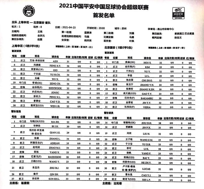 来源:直播车04-23 19:03直播车讯 北京时间4月23日,中超联赛第一轮,北京国安对阵上海申花,赛前,这场比赛的首发名单出炉。