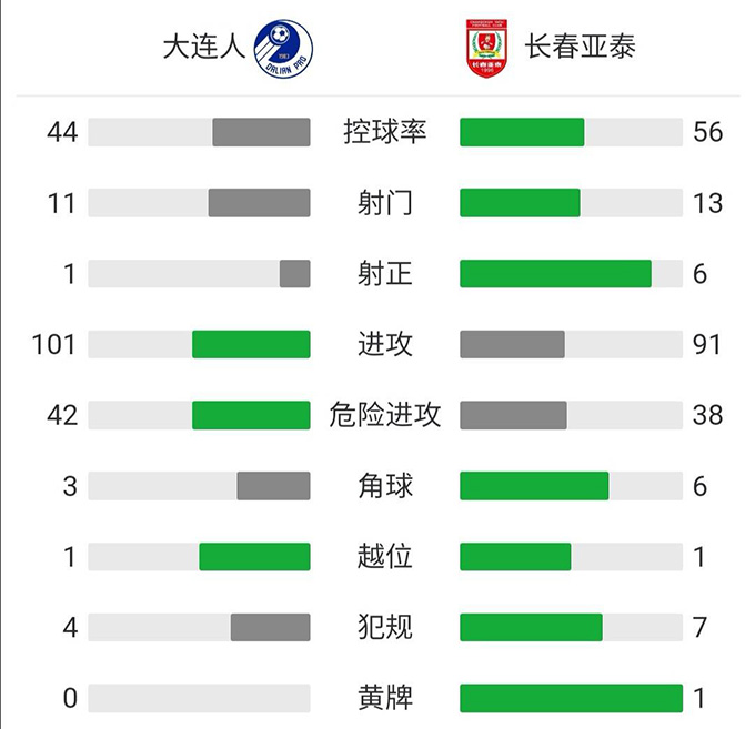 全场比赛结束,亚泰2-1击败大连人。
