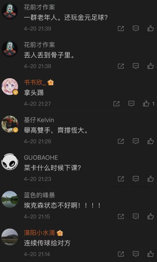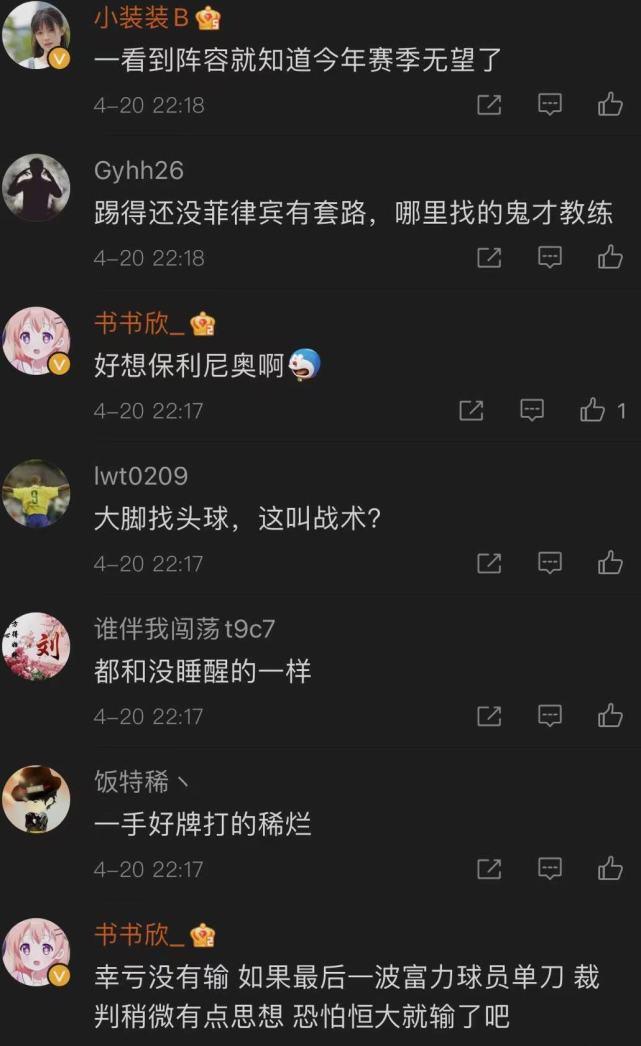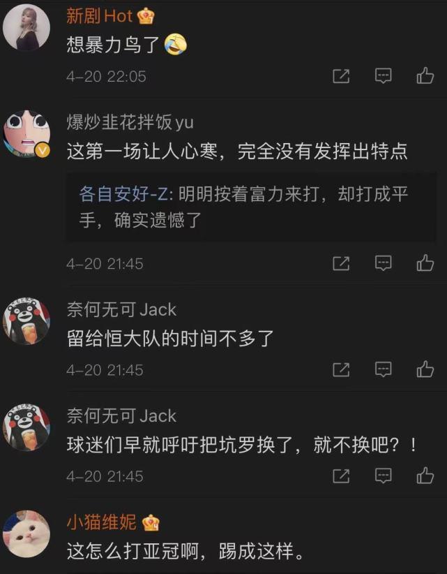 还有人则对全队的状态非常不满:“”第1场就让球迷心寒!完全没有发挥特点!;“丢人丢到骨子里了!”;“一群老年人在踢球,还玩金元足球吗?”;“想念暴力鸟的第1天!”;“踢成这样还怎么打亚冠?”