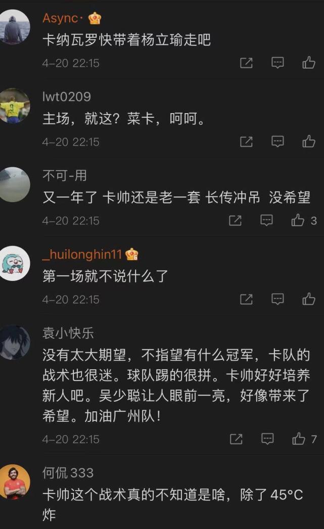 一些球迷首当其冲的炮轰了球队的主帅卡纳瓦罗:“一手好牌打得稀烂!菜卡什么时候下课?”;“球迷早就呼吁把卡纳瓦罗换了?为什么不听?”;“真的有战术吗?除了45度长传冲吊还会什么?”:“老老实实打4-2-3-1不好吗?非要用上赛季意甲失败的4-3-3阵型!”;“卡纳瓦罗带着你的杨立瑜走吧!”