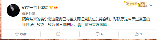 上月底,费尔南迪尼奥从美国飞往中国,从广州入境后他也随即开始了隔离观察。目前,隔离结束的费尔南迪尼奥已与重庆两江竞技在东莞会合,球队原定今天进赛区的计划发生改变,改为19日进赛区。