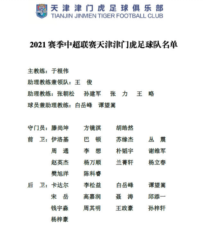 来源:直播车04-14 15:48直播车讯北京时间4月14日,中超天津津门虎官方宣布新队徽和新赛季的球队名单。于根伟担任主帅,谭望嵩和白岳峰担任球员兼任助理教练,泰山队的李松益、卡达尔和陈科睿租借天津,成为球队的主力选择。