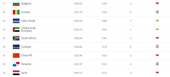 国际排名下降2名后, 国足被佛得角和库拉索超越