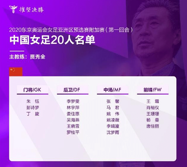 详细的20人大名单为:门将:朱钰、彭诗梦、丁旋;后卫:李梦雯、林宇萍、娄佳慧、吴海燕、王晓雪、罗桂平;中场:张馨、马君、姚伟、姚凌薇、李晴瞳、沈梦雨;前锋:王霜、肖裕仪、王珊珊、杨曼、唐佳丽。不出意外,王霜、王珊珊、唐佳丽将成为进攻三叉戟,她们是中国女足现役进攻能力最强的三人。