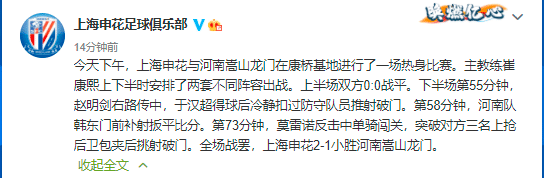 直播车讯北京时间4月3日下午,在申花康桥基地进行的一场热身赛中,上海申花以2-1的比分击败了河南嵩山龙门。