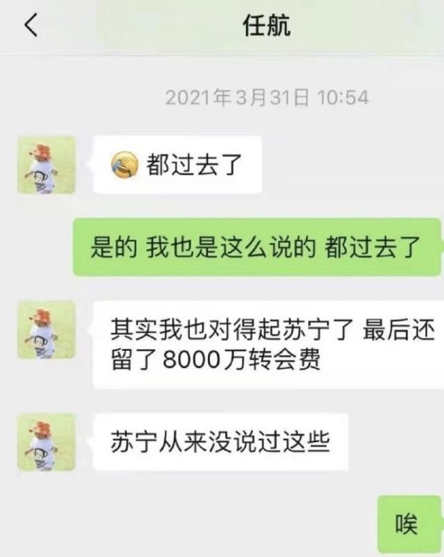 来源:直播车04-02 15:29直播车讯 在江苏(苏宁)队正式无缘参加中超、退出历史舞台之后,北京时间4月1日晚,知名大V “江苏队球迷俱乐部”在社交账号上,曝光了4年前一段鲜为人知的往事,为江苏旧将任航“洗冤”。在“江苏队球迷俱乐部”曝光的与任航的聊天记录中显示,这位32岁的前国脚在转会河北时,曾为俱乐部留下8000万元人民币的转会费,但苏宁不仅从未对外提及此事,甚至还任由外界恶意抹黑球员。