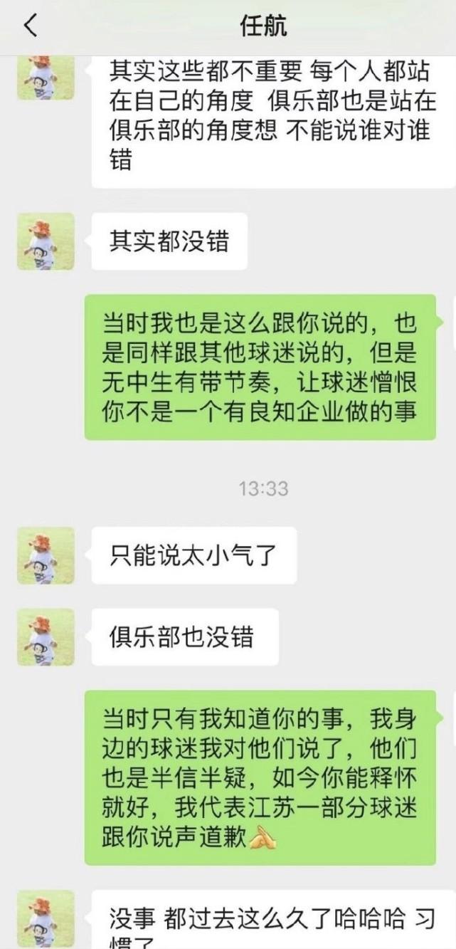 谈到这件往事,任航在与“江苏队球迷俱乐部”聊天时,淡然而表示:“都过去这么久了,我(被骂)习惯了!我留下8千万元转会费,也算是对得起苏宁了!”如今苏宁俱乐部已经解散,不知道4年后“沉冤昭雪”的任航,是否会得到江苏球迷迟到已久的谅解呢?