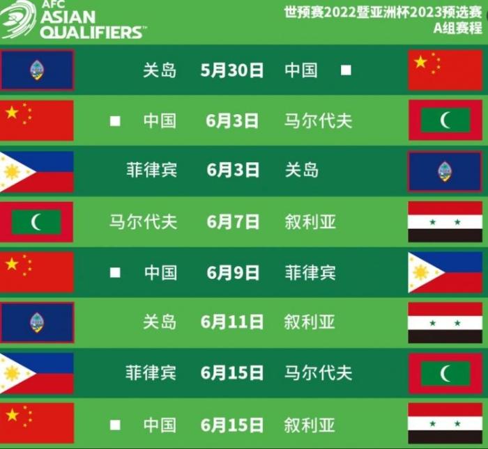 直播车讯 北京时间4月1日,根据亚足联官方消息,预选赛第二阶段剩余比赛日期已经确定,中国队所在A组的比赛将在苏州举行。国足将于5月30日率先迎战关岛,6月15日对阵叙利亚。