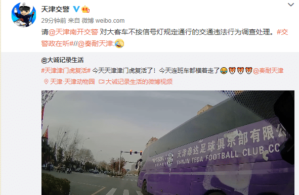 津门虎成功复活!球队大巴闯红灯+直行道掉头,天津交警在线处理