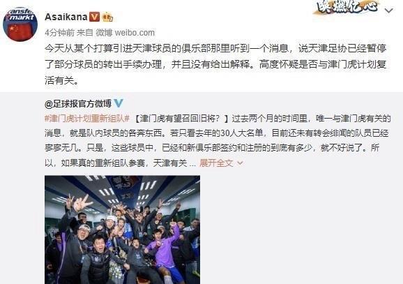 天津津门虎方面,动静很多。德国转会市场中国区管理员朱艺透露,从某支打算引进天津球员的俱乐部得知消息,天津足协已暂停部分球员转出手续办理,并且没有给出解释,这已经被外界高度怀疑是否与津门虎计划复活有关。朱艺的这则消息,也得到了国内知名记者白国华的证实。此外,津门虎队愿意将胸前的广告留给运营方,来补偿运营方的“担债”负担。至于江苏队方面,被苏宁集团放弃的他们,已经找到了一位“刘老板”,但目前还没有说已经确定成了。