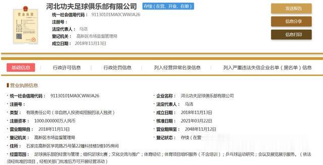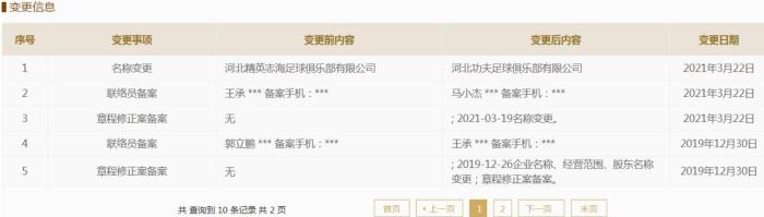 直播车3月23日讯根据国家企业信息查询系统显示,河北精英足球俱乐部更名为河北功夫足球俱乐部。