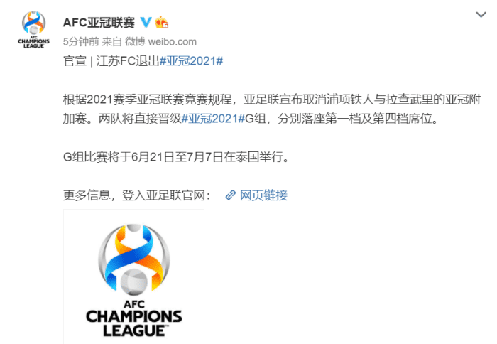 直播车3月18日讯 据亚足联官方消息,江苏队退出2021亚冠联赛。