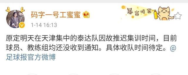 鲁蜜在个人微博写道:“原定明天在天津集中的泰达队因故推迟集训时间,目前球员、教练组均还没收到通知。具体收队时间待定。”
