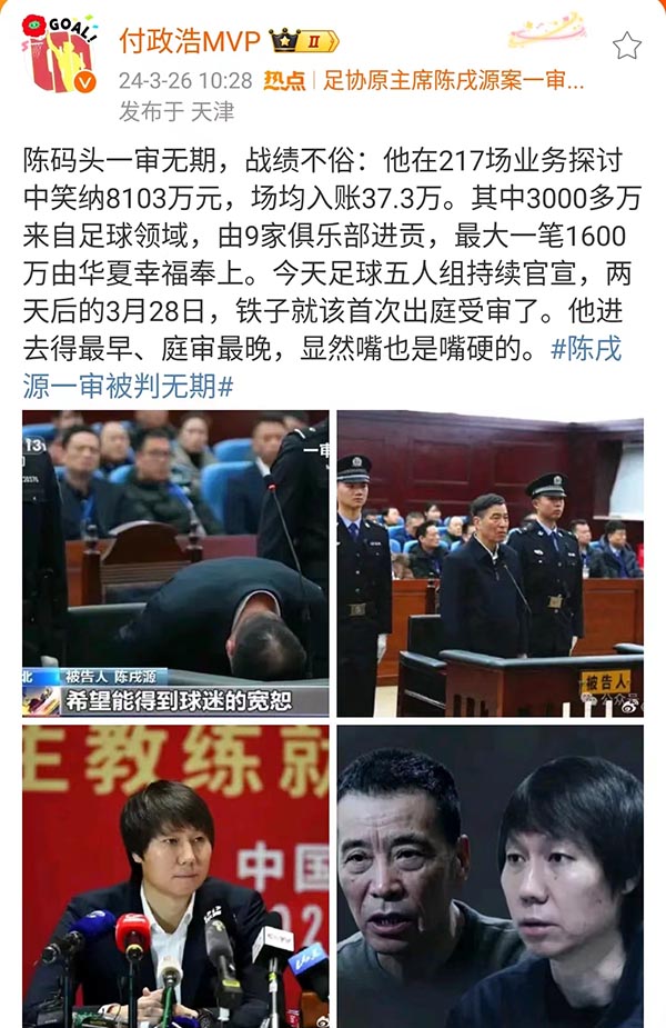 来源:直播车03-27 17:16直播车讯 昨日3月26日,中国足坛风暴中卷入的陈码头等人的一审判决结果也是一个个出炉,比如说陈码头,因为受贿8103万,陈码头哪怕全部退赃了,还是被判了一个无期,这也是中国体坛至今最高的处罚。
