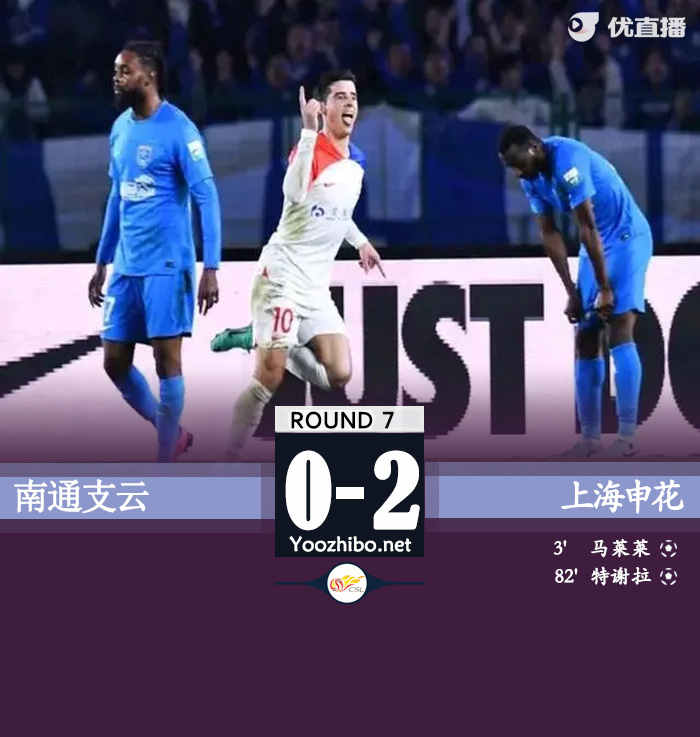 第2分钟,南通倒脚时马晟不慎脚下打滑,路易斯断球快速推进无私横传,马莱莱轻松推射破门,申花1-0。