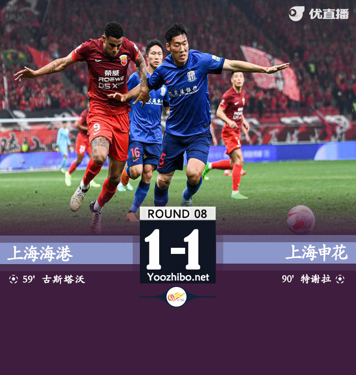 来源:直播车04-27 22:22 直播车讯:北京时间4月27日,中国足球顶级联赛联赛第8轮,上海海港主场对阵上海申花。比赛第59分钟,古斯塔沃乱战中率先破门,第90分钟,特谢拉禁区内停球后射门扳平,补时第7分钟,汪海健绝杀因于汉超越位在先被吹。最终比分上海海港1-1上海申花。